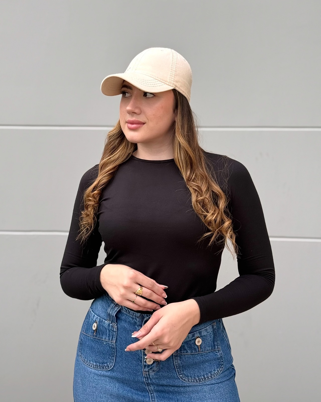 Sencilla, versátil y con mucho estilo. La Básica Negra Long Fit es ese esencial que se adapta a cualquier ocasión. Con mangas largas y un corte ajustado que estiliza, esta camiseta es ideal para combinar con looks casuales o elevar outfits más elegantes. Un básico imprescindible para la temporada.