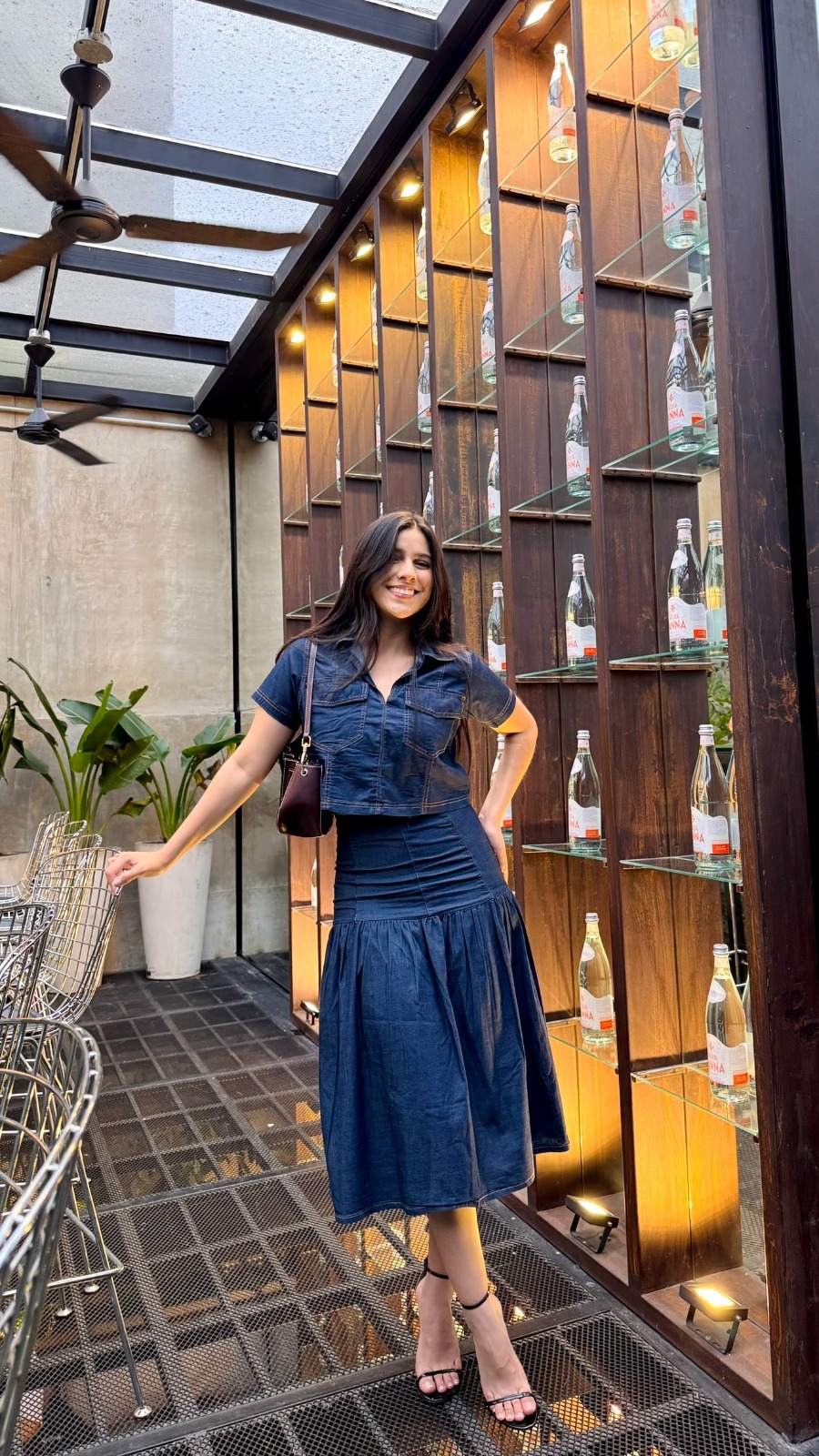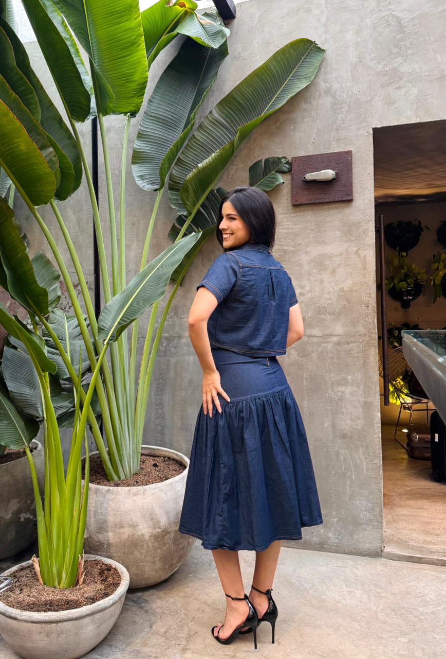 El Conjunto Chambray Clásico Midi está compuesto por blusa y falda en chambray, con un diseño limpio y femenino. Su silueta cómoda y fresca lo convierte en una opción ideal para looks sobrios y versátiles para el día a día.