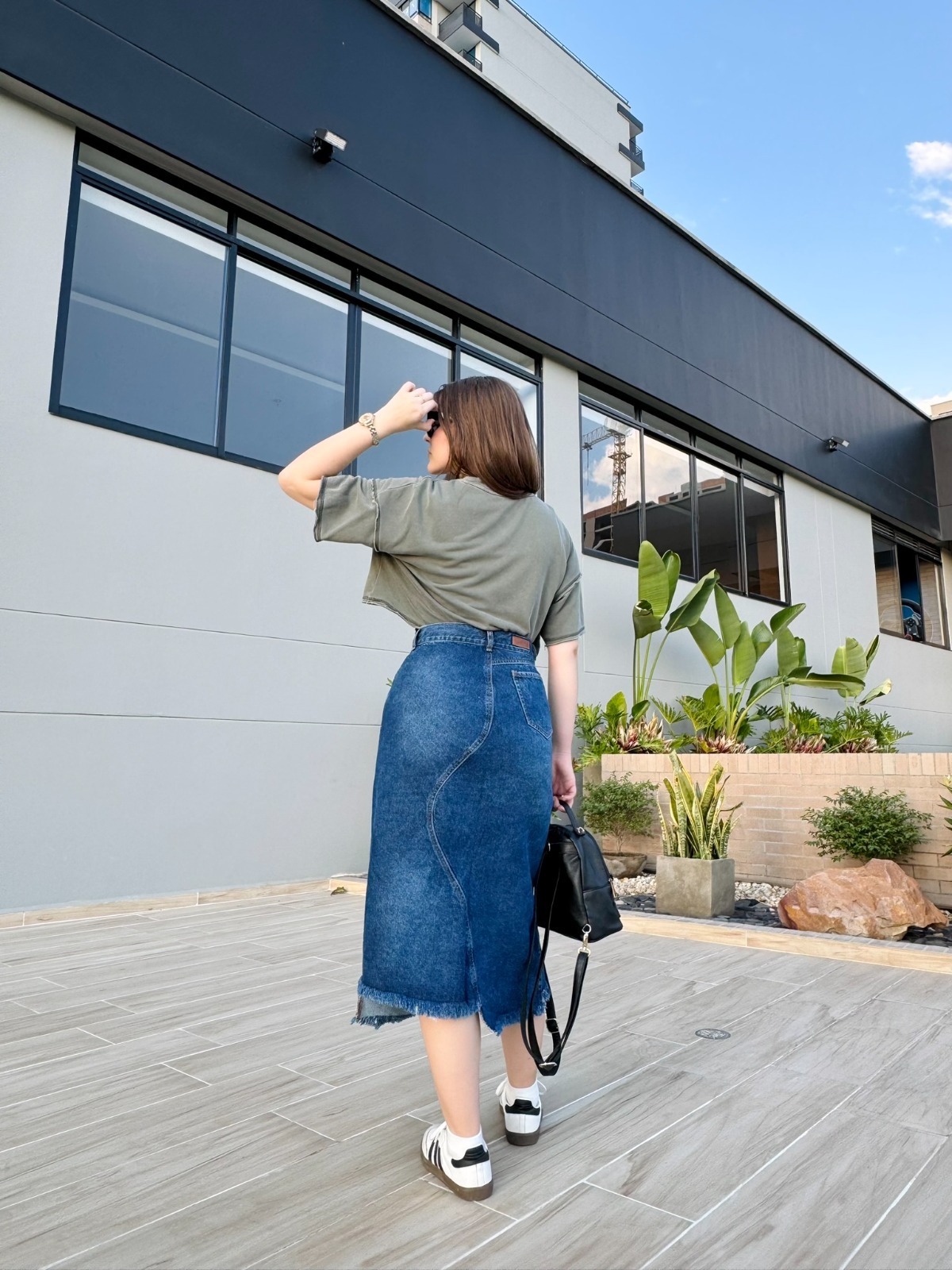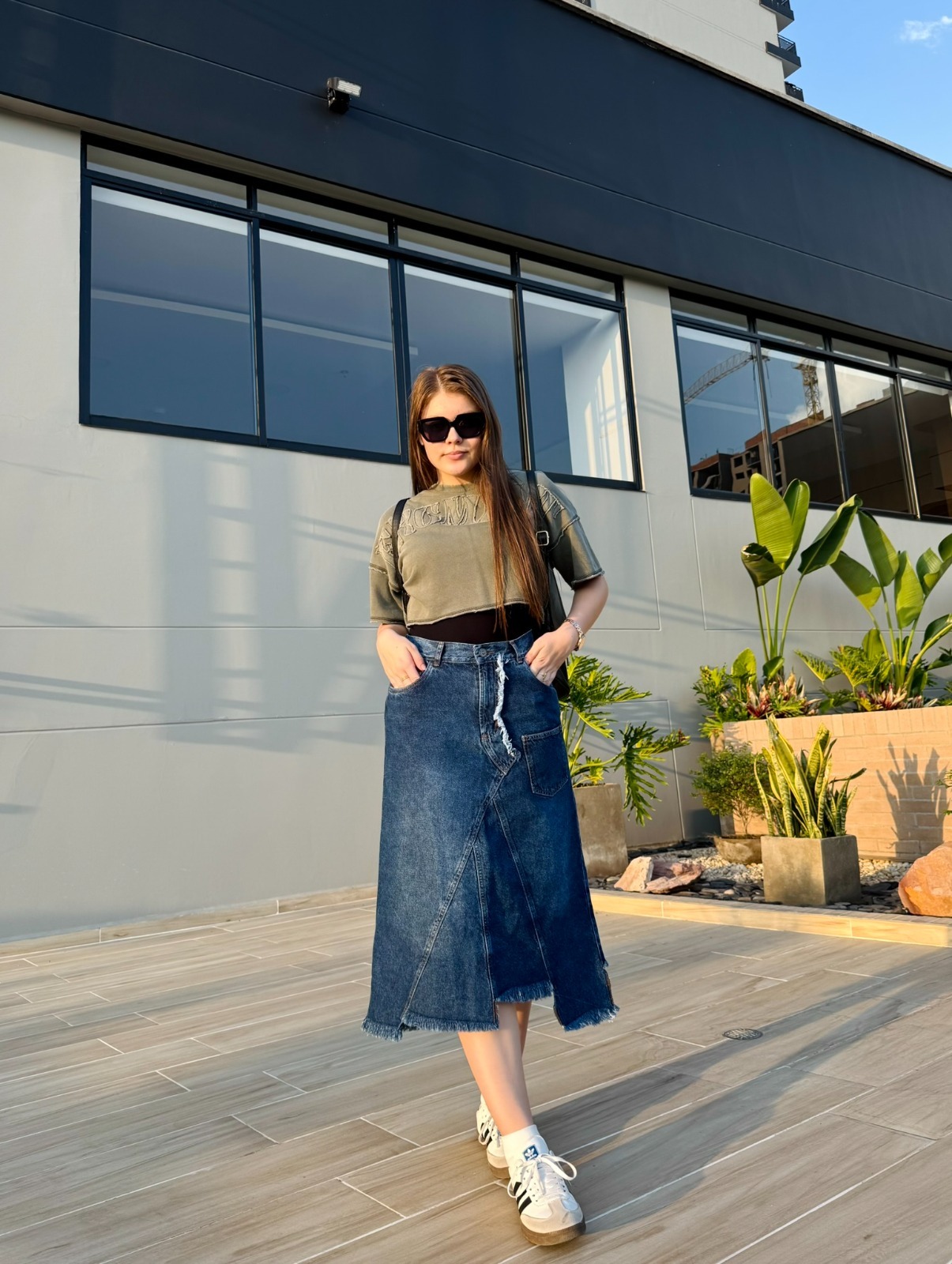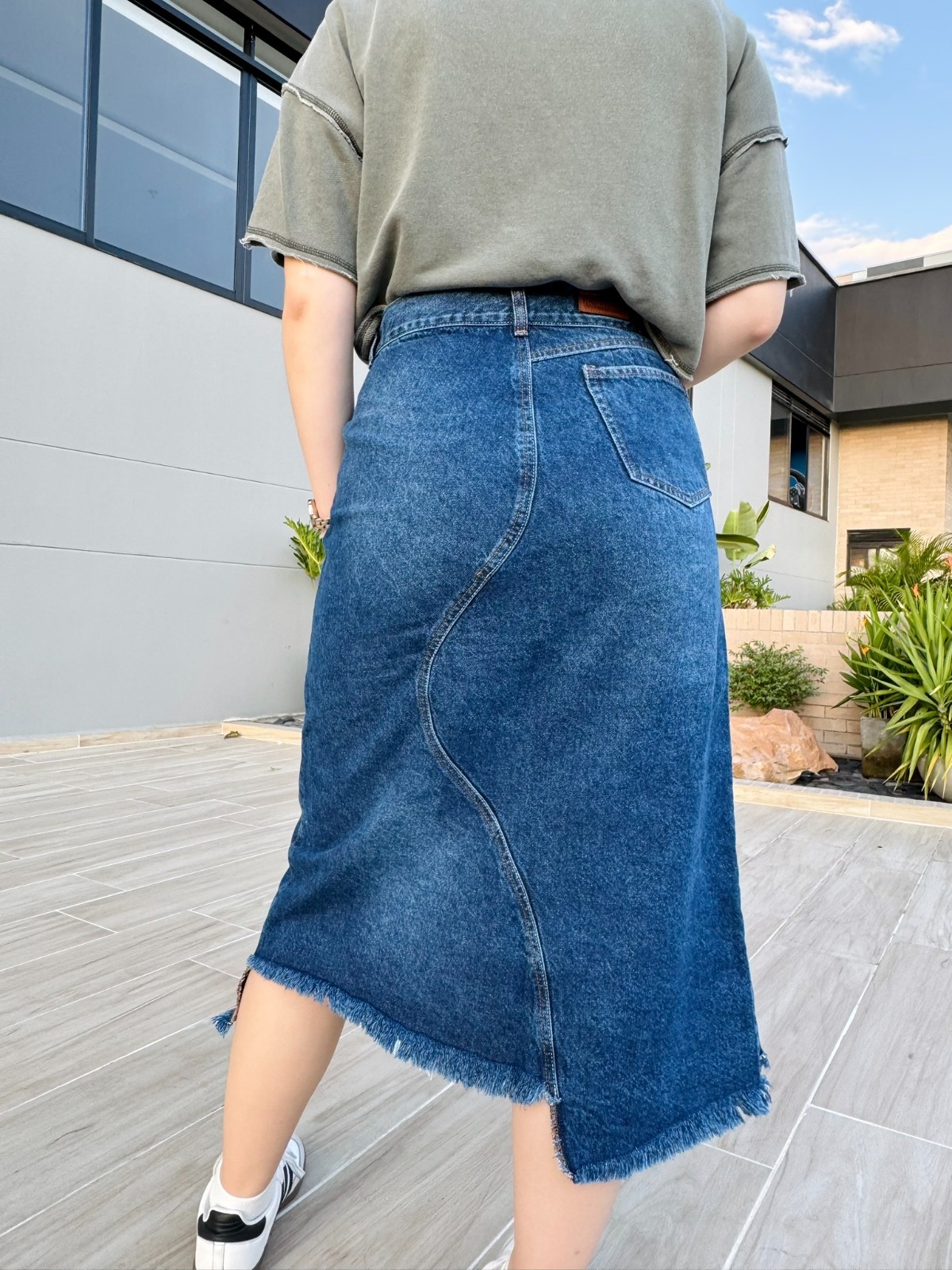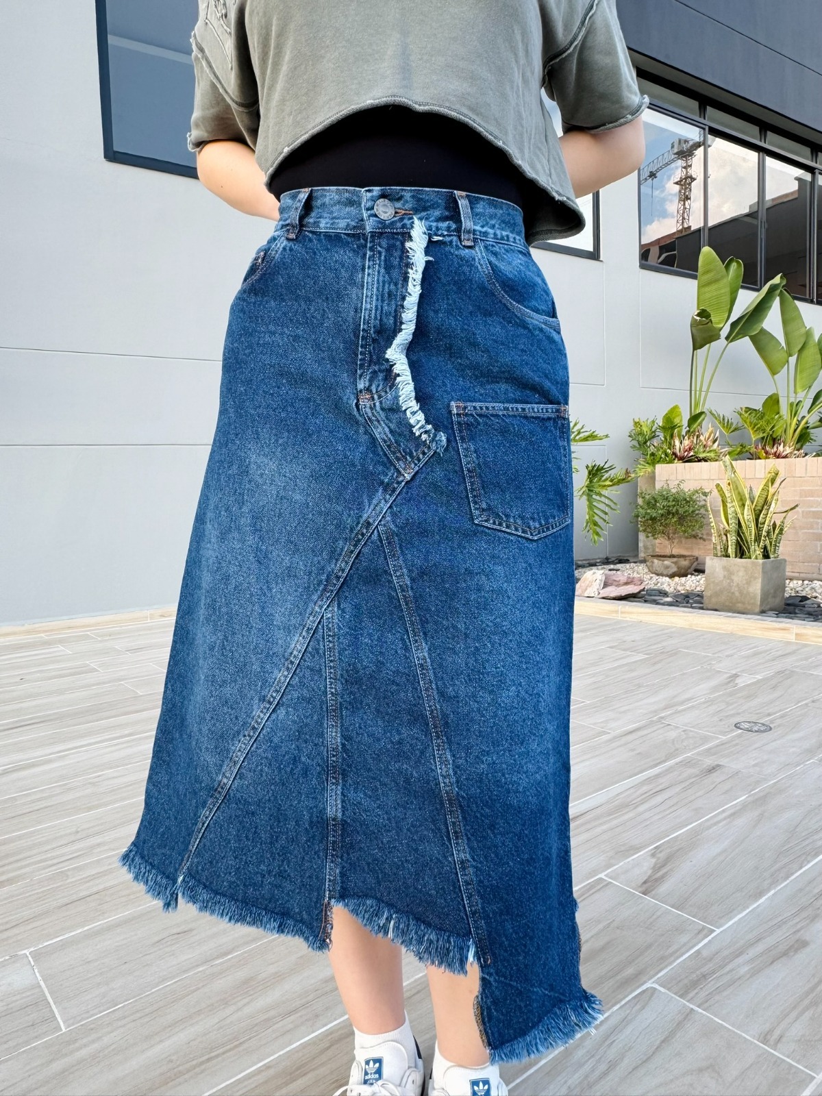 La Falda Denim Asimétrica Desgastada es una pieza con un diseño audaz y auténtico, perfecta para quienes buscan un look urbano con un toque moderno. Confeccionada en denim rígido de color azul oscuro, su diseño se distingue por costuras asimétricas, un efecto desgastado en la parte frontal y un dobladillo deshilachado, que aportan un estilo desenfadado y contemporáneo. Además, su bolsillo traslapado decorativo le añade un detalle único.