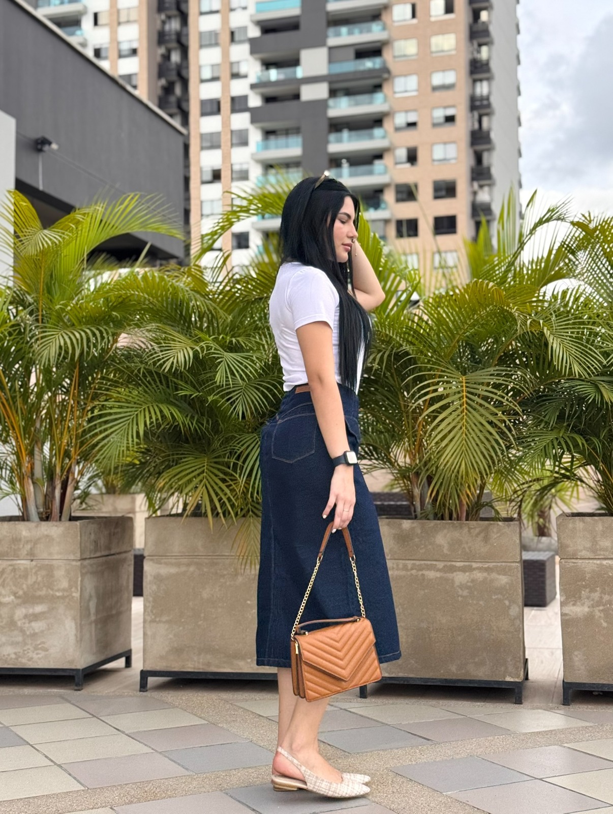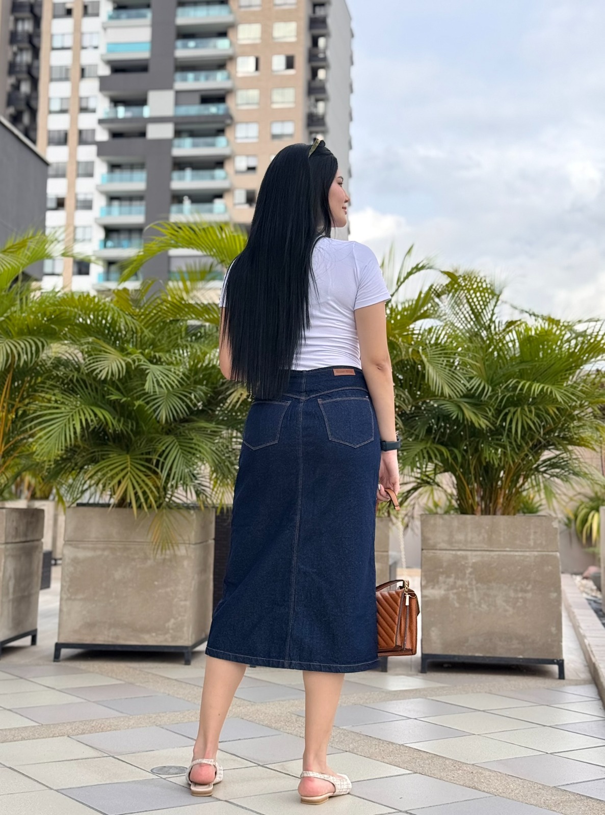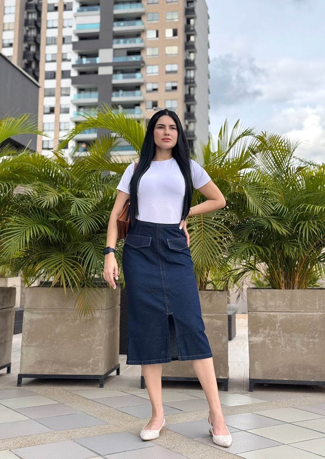 Sofisticada y funcional, la Falda Denim con Bolsillos de Solapa y Abertura Frontal destaca por su diseño estructurado y versátil. Confeccionada en mezclilla de tono oscuro, presenta dos bolsillos decorativos tipo solapa que añaden carácter sin perder elegancia. Su corte recto con abertura frontal la hace ideal para moverse con libertad mientras mantiene una silueta favorecedora. Perfecta para outfits de oficina o para elevar un look casual.