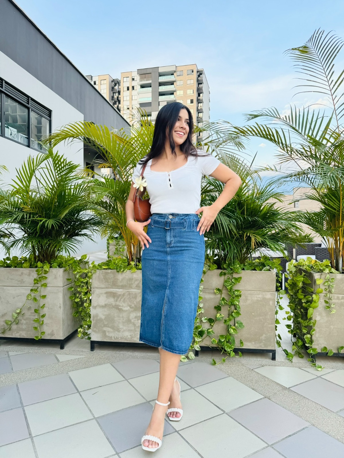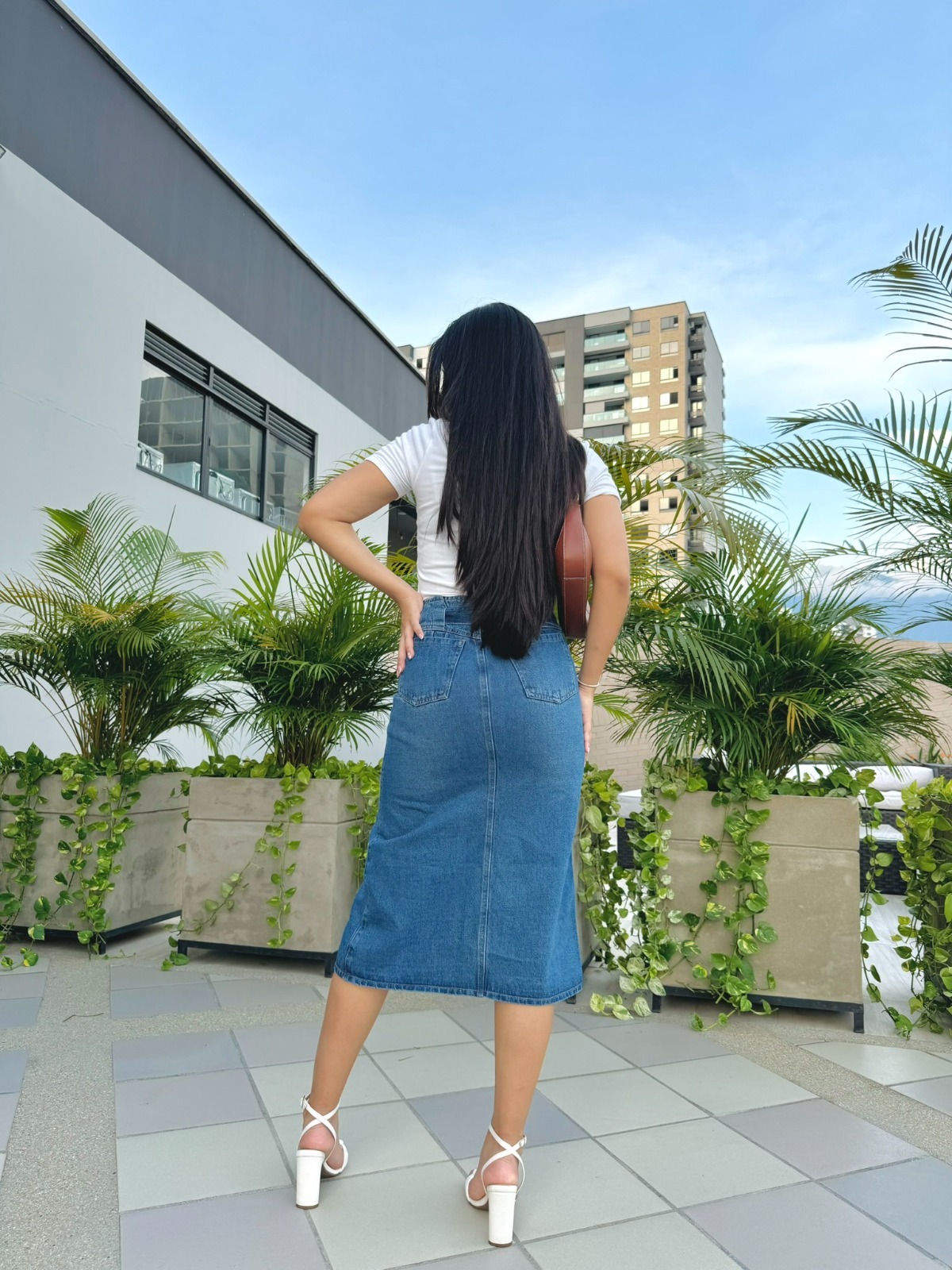 La Falda Denim con Cinturón y Abertura es la combinación perfecta entre elegancia y estilo casual. Confeccionada en denim rígido de color azul medio, su diseño estiliza la figura con una silueta recta y un cinturón integrado con hebilla metálica, que permite un ajuste cómodo y favorecedor. Su costura central y abertura frontal le añaden un toque moderno y sofisticado.