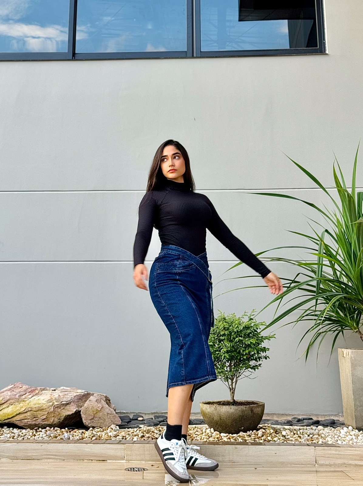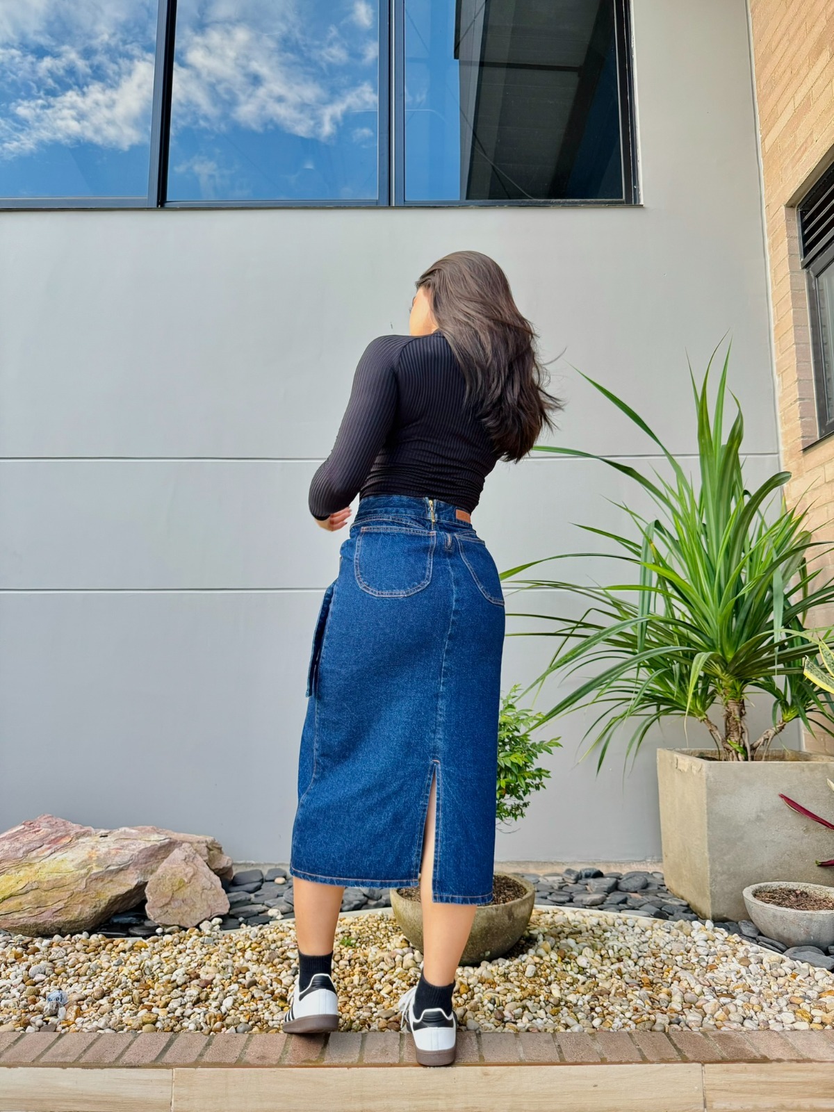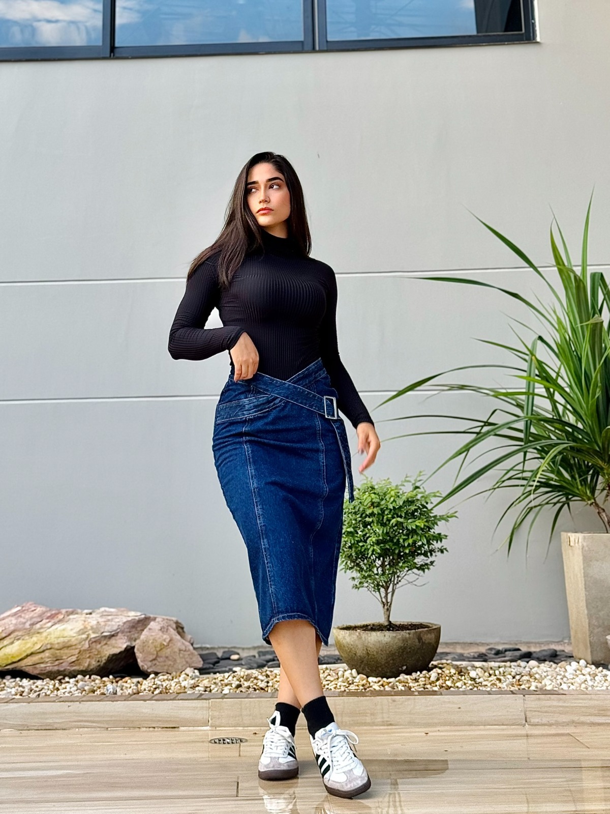 La Falda Denim Cruzada con Hebilla es una pieza sofisticada y moderna que destaca por su diseño envolvente. Confeccionada en denim rígido de color azul oscuro, su estructura presenta un corte cruzado con cinturón integrado y hebilla metálica, permitiendo un ajuste favorecedor a la cintura. Su silueta recta estiliza la figura, ofreciendo un look elegante y versátil.