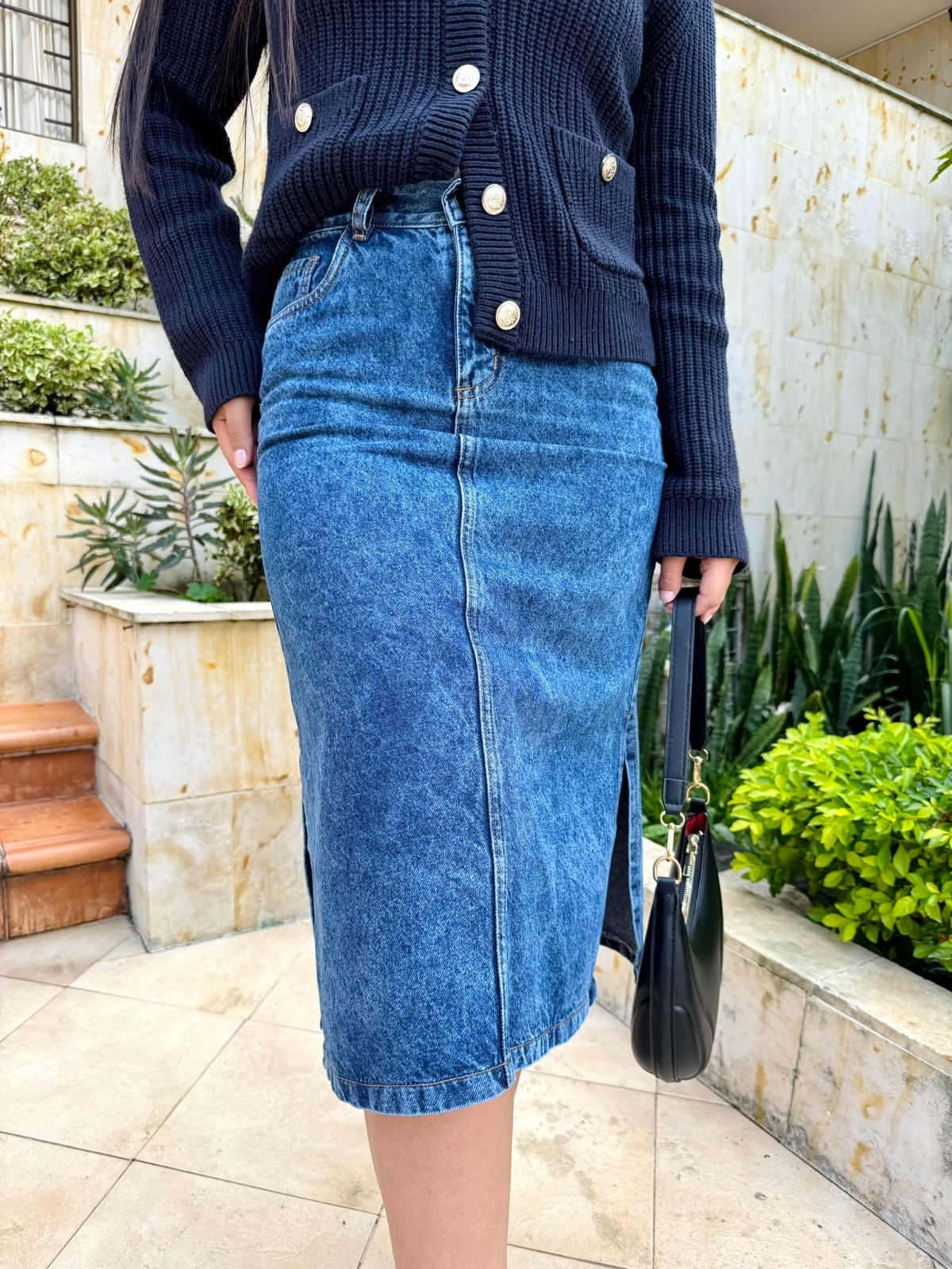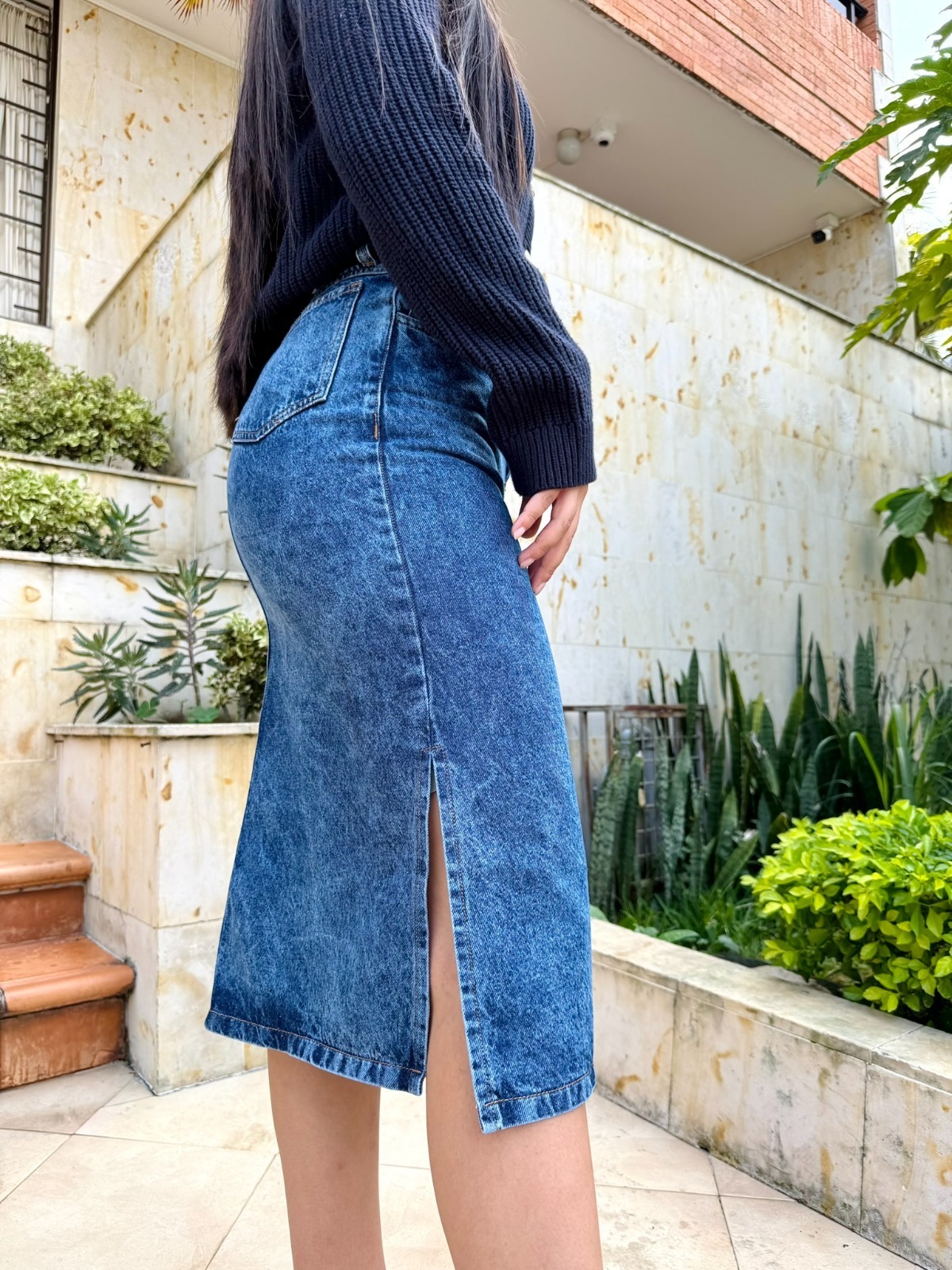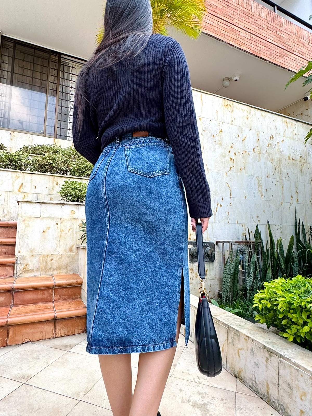 La Falda Denim Lavado Mármol con Aberturas Laterales es una prenda con un acabado moderno y un diseño estructurado que estiliza la figura. Confeccionada en denim rígido de color azul medio con efecto marmoleado, su diseño destaca por su silueta recta y aberturas en ambos costados, que brindan mayor comodidad y un toque sofisticado.