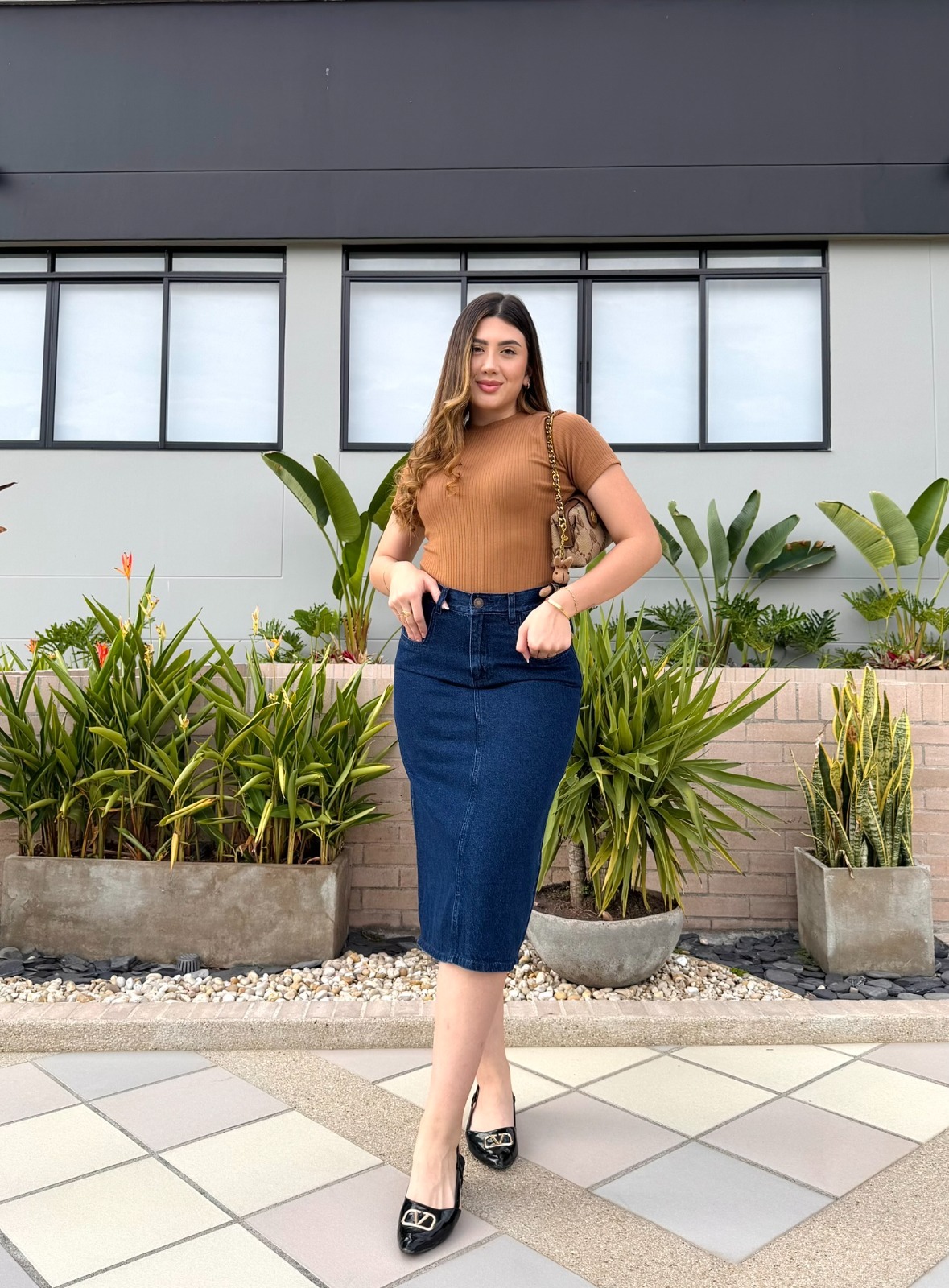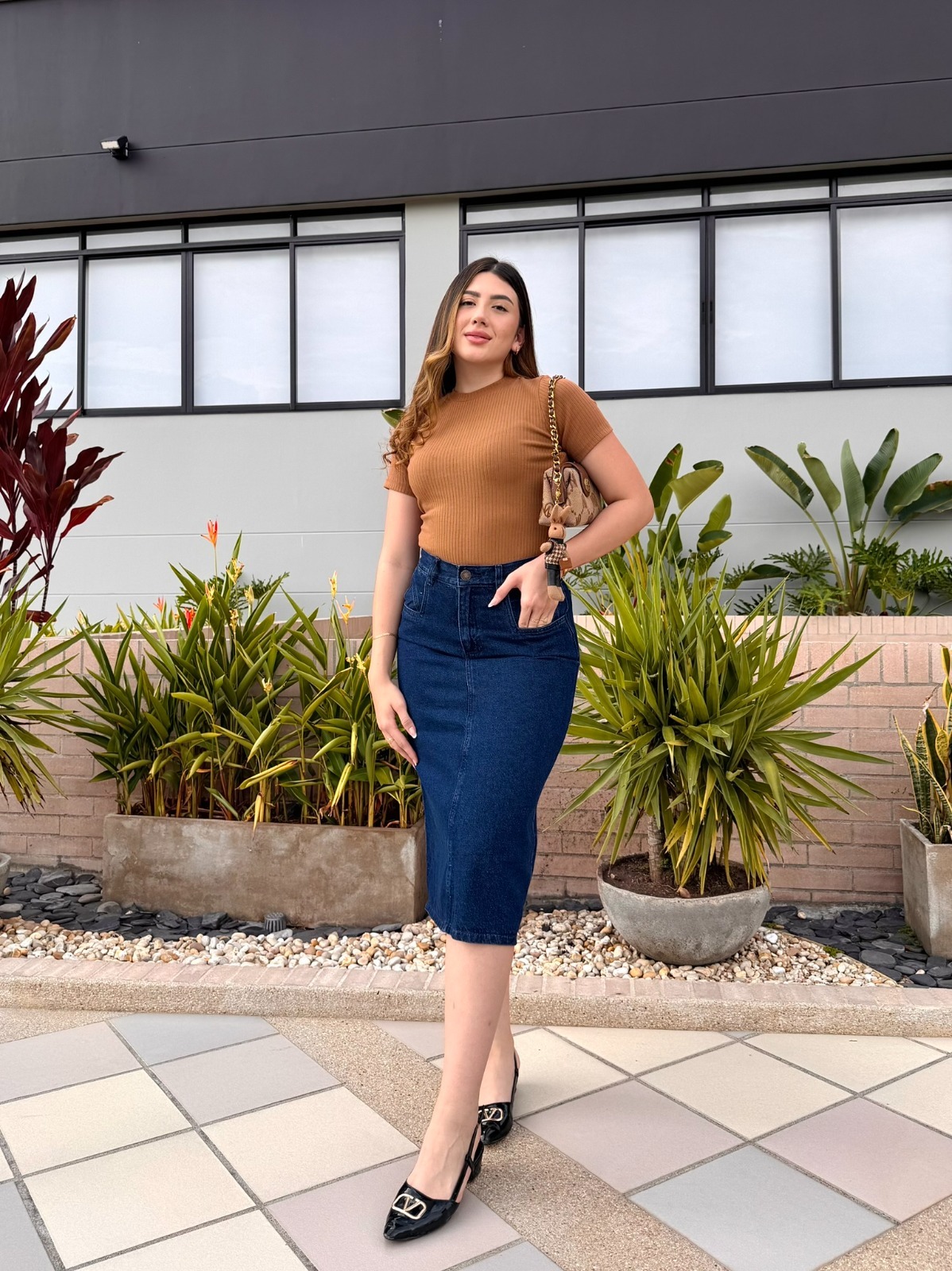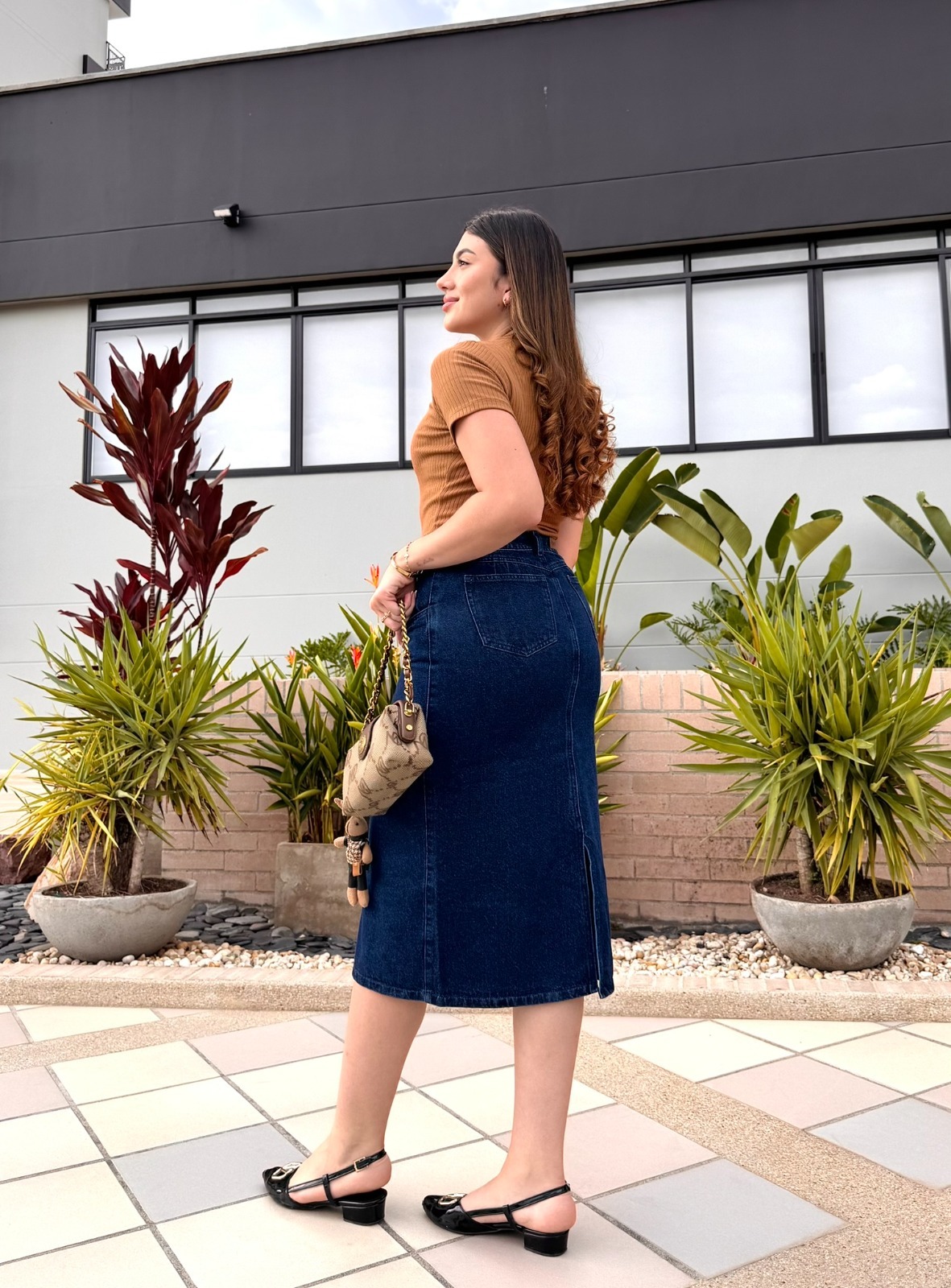 La Falda Denim Midi con Bolsillos Diagonales es ese básico con carácter que eleva cualquier outfit. Su tono azul oscuro aporta elegancia y versatilidad, mientras que los bolsillos delanteros en corte diagonal le dan un toque moderno y diferente. Su silueta ajustada resalta tu figura sin sacrificar comodidad. Ideal para llevar del trabajo al fin de semana, esta prenda se adapta a múltiples estilos: desde un look casual con tenis hasta uno más sofisticado con tacones.