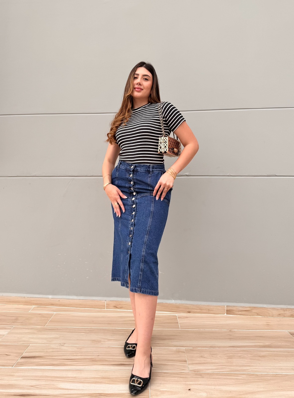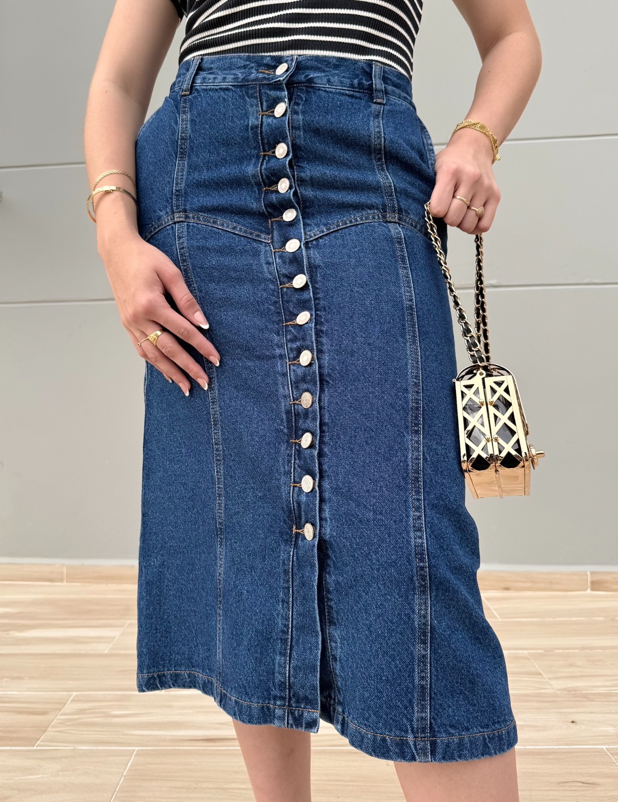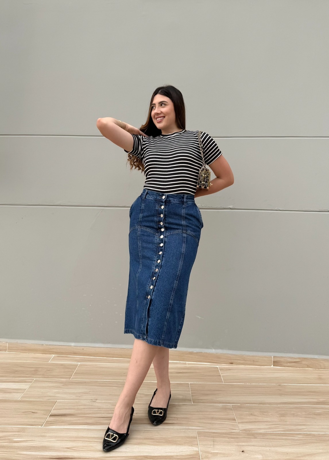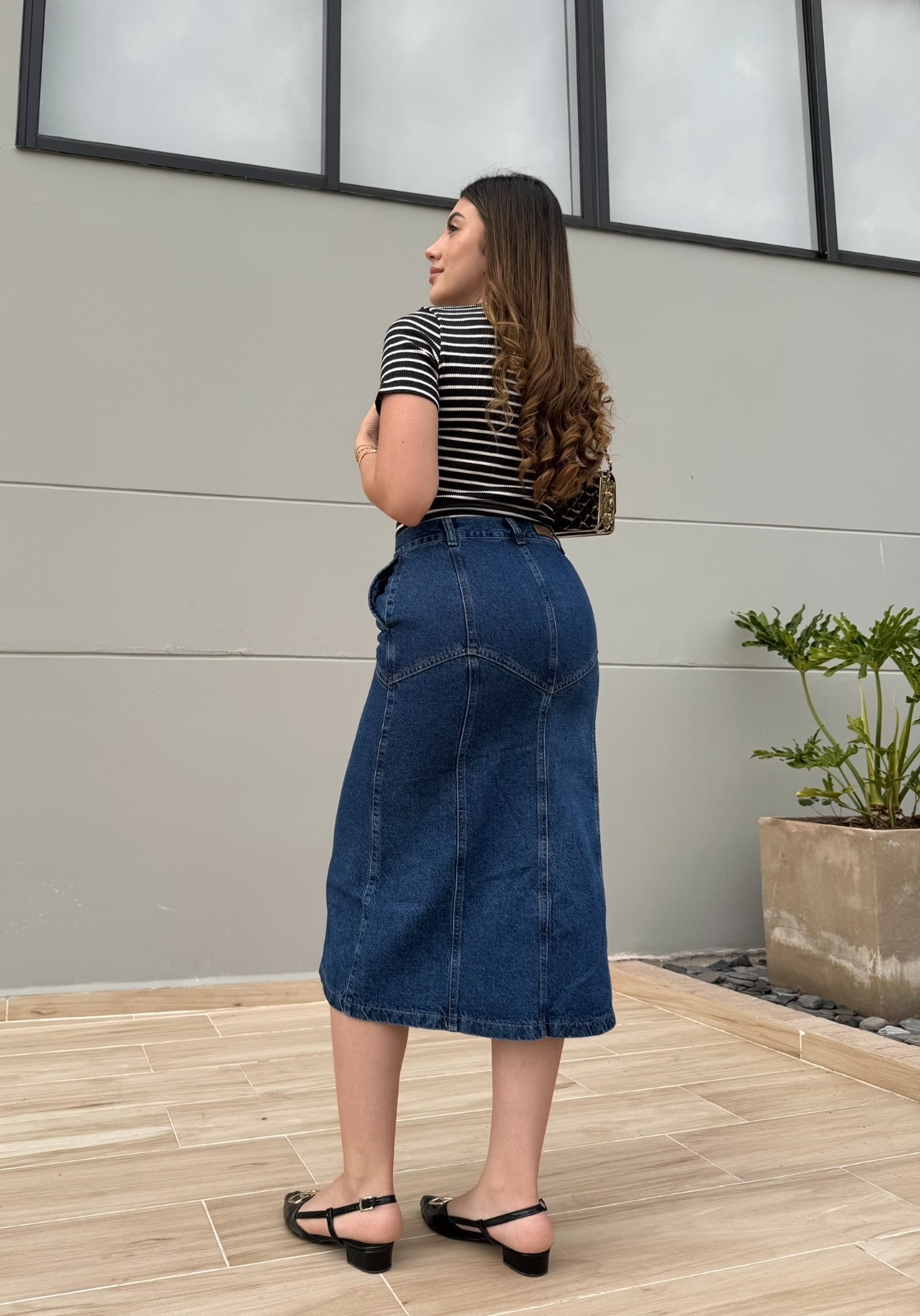 Eleva tu estilo con esta Falda Denim Midi, una prenda esencial con un giro moderno. Su silueta entallada y femenina se acentúa con una elegante línea de botones metálicos al frente, añadiendo un toque vintage que nunca pasa de moda. El diseño a media pierna la hace ideal tanto para el día como para la noche, combinando a la perfección con blusas o camisetas . Hecha en mezclilla de alta calidad, es la mezcla ideal de comodidad y estilo.