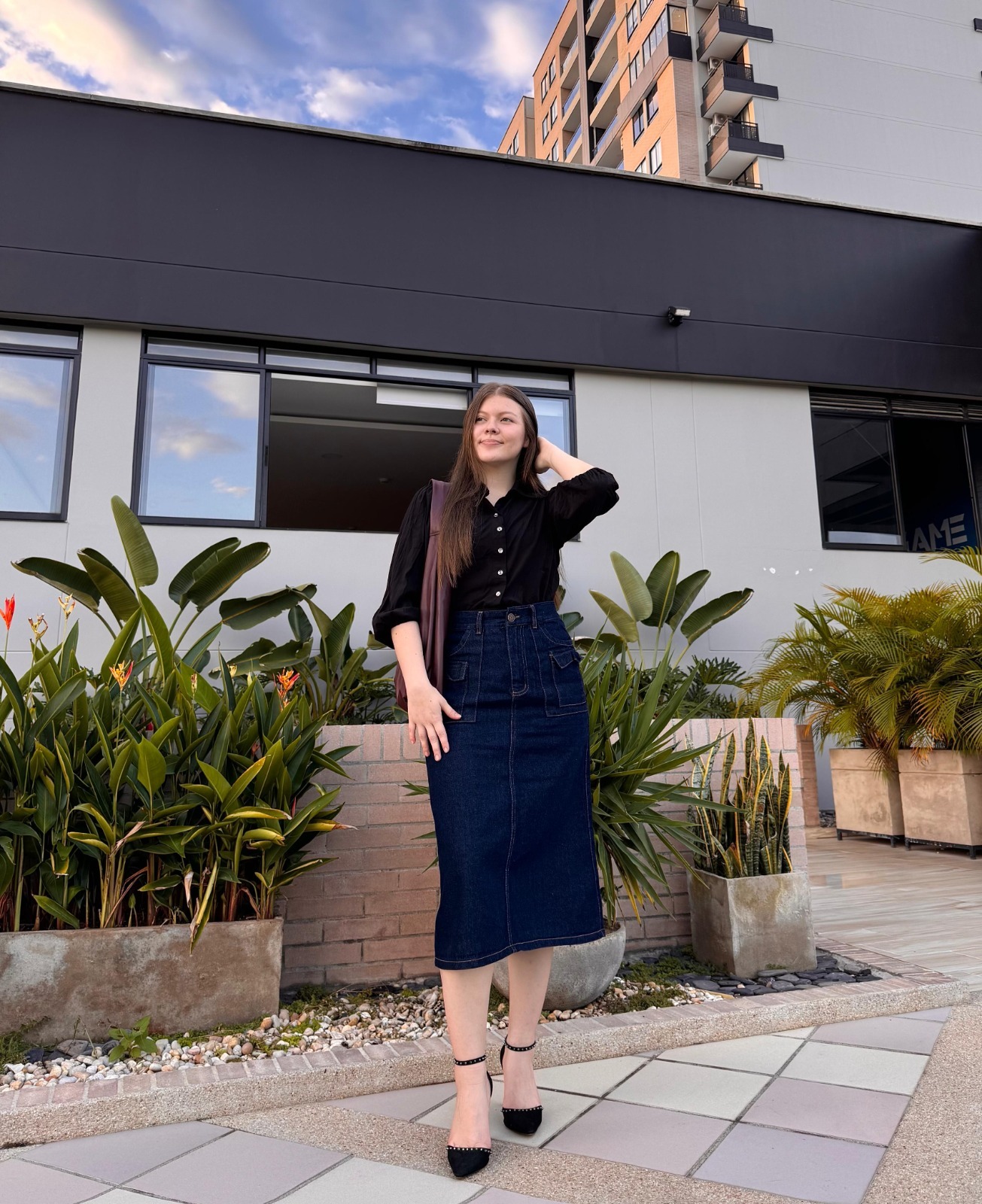 Falda midi en denim rígido con bolsillos tipo cargo al frente, un diseño moderno y versátil que combina estilo y practicidad. Perfecta para darle un toque urbano y sofisticado a tus outfits.
