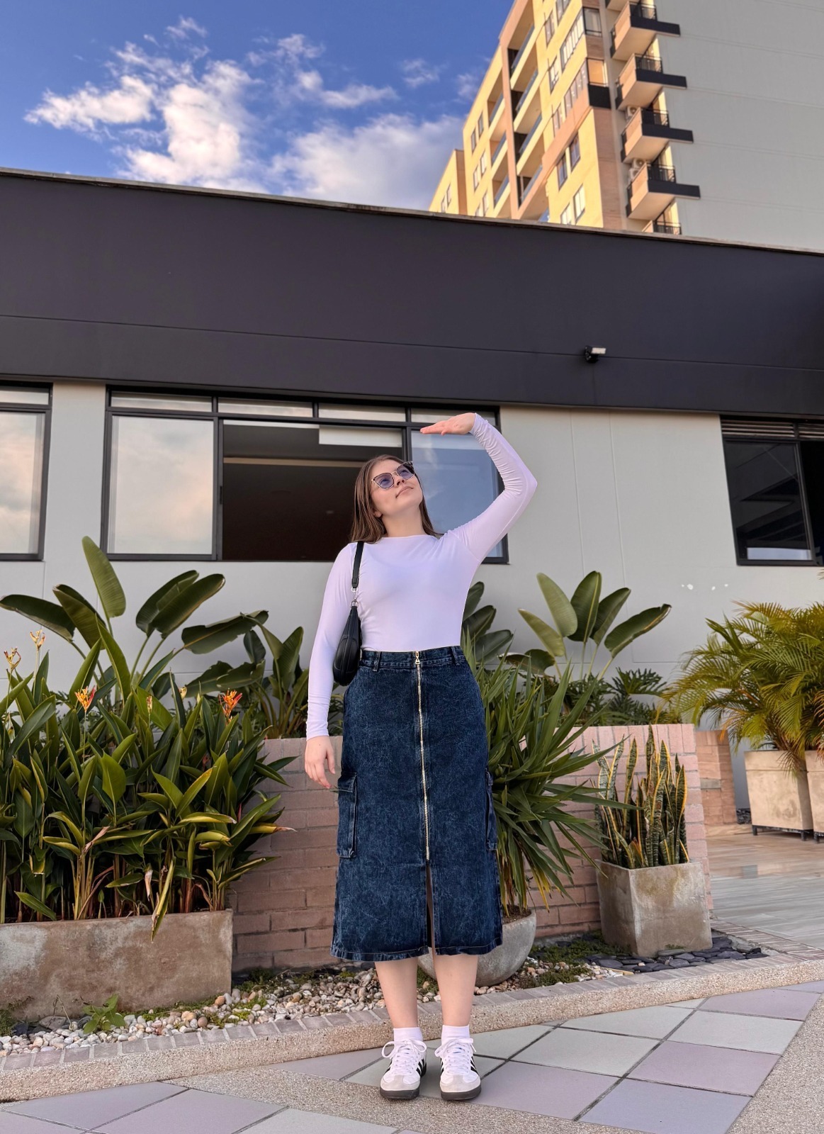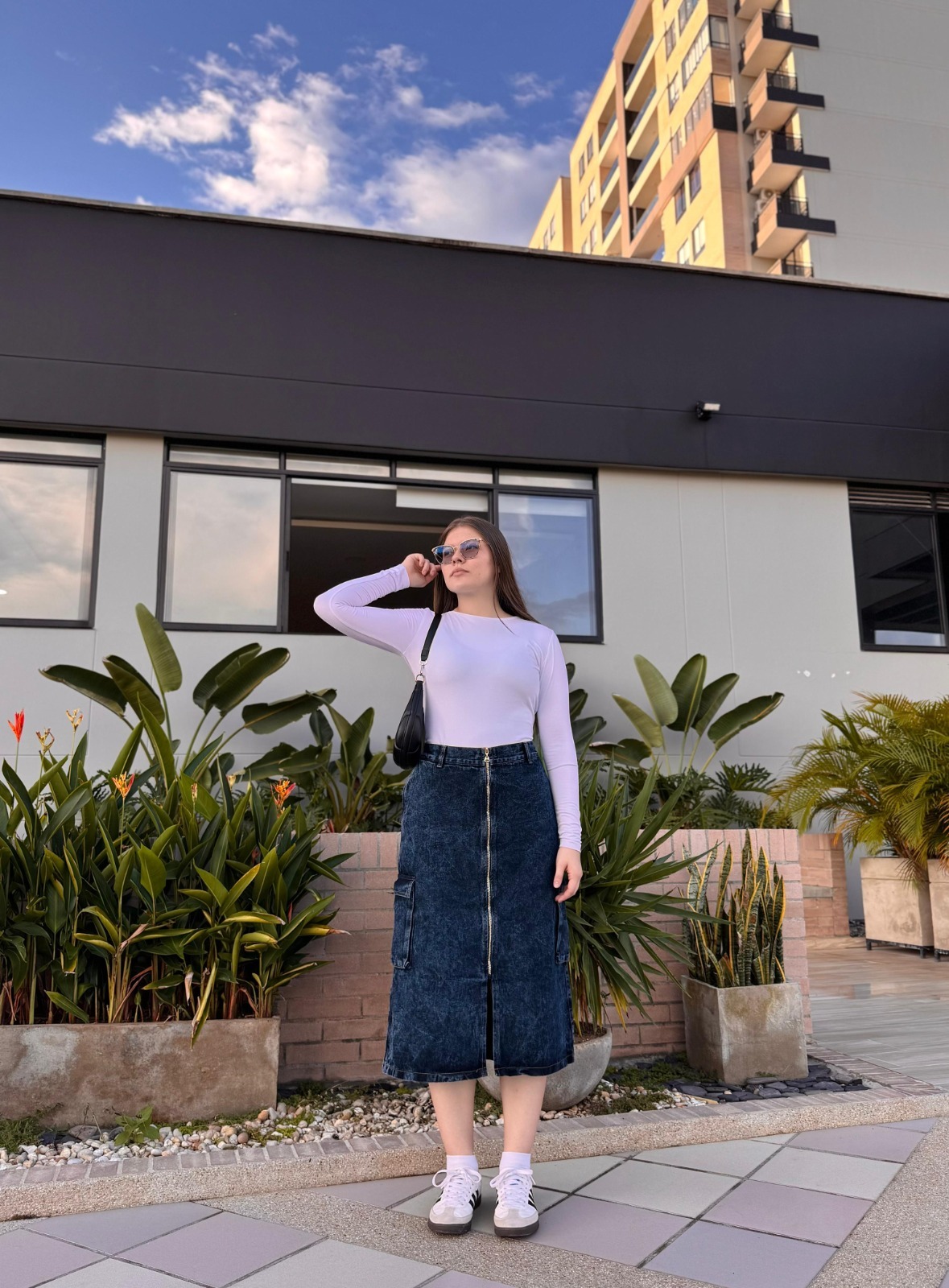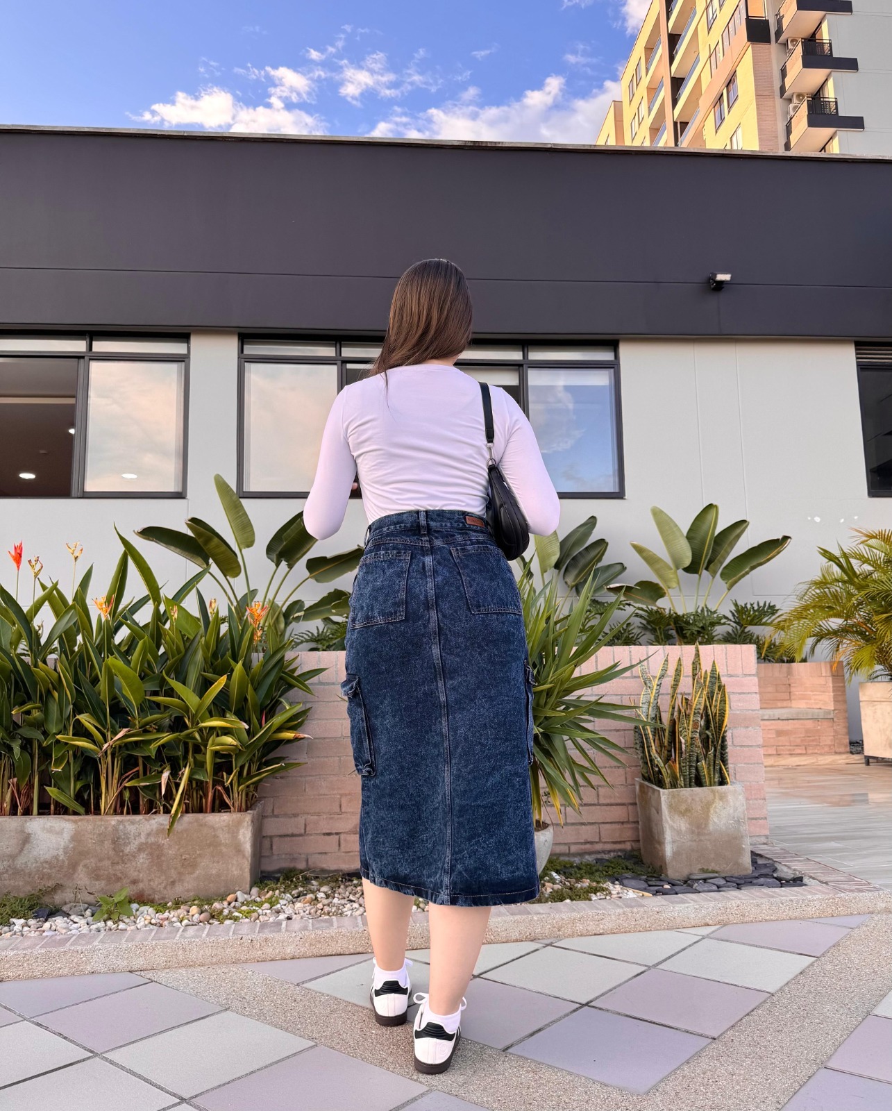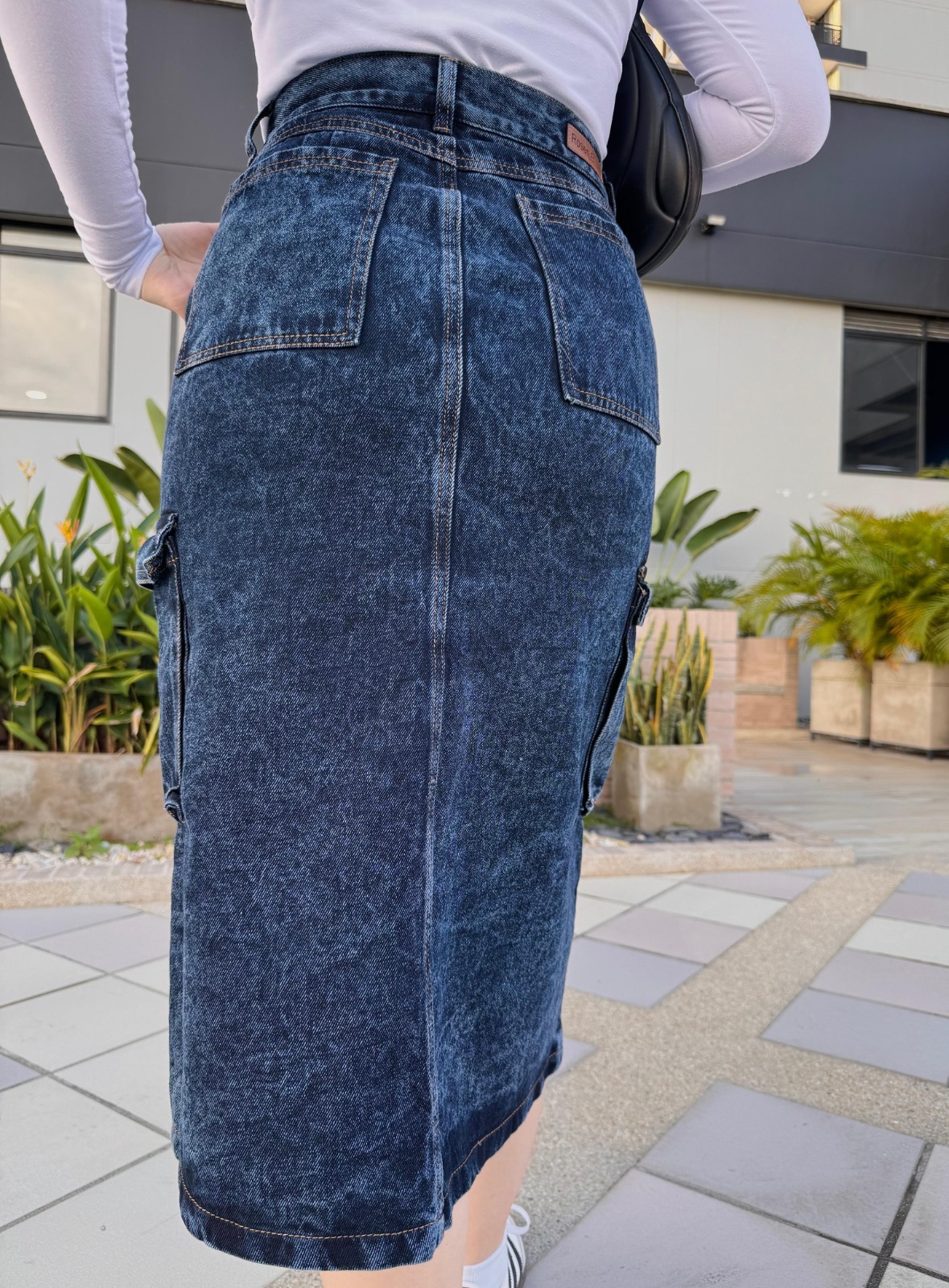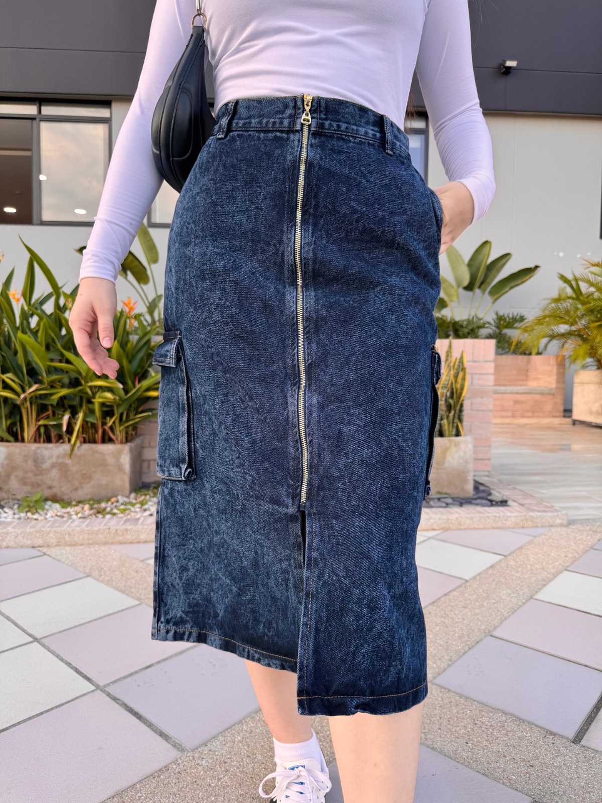 Falda midi en denim rígido con cierre frontal y bolsillos laterales cargo. Su efecto lavado oscuro y detalles metálicos la convierten en una prenda audaz y moderna, ideal para looks urbanos con personalidad.
